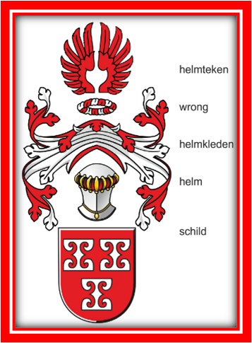 Let wel: Dames-ridder kunnen opteren voor een ovaal schild omgeven door een krans van natuurlijke elementen. Die kunnen ook vrij gekozen worden. Voor een zogenaamd ‘damesschild’ zijn er dan geen helm, wrong, helmkleden en halsjuweel.