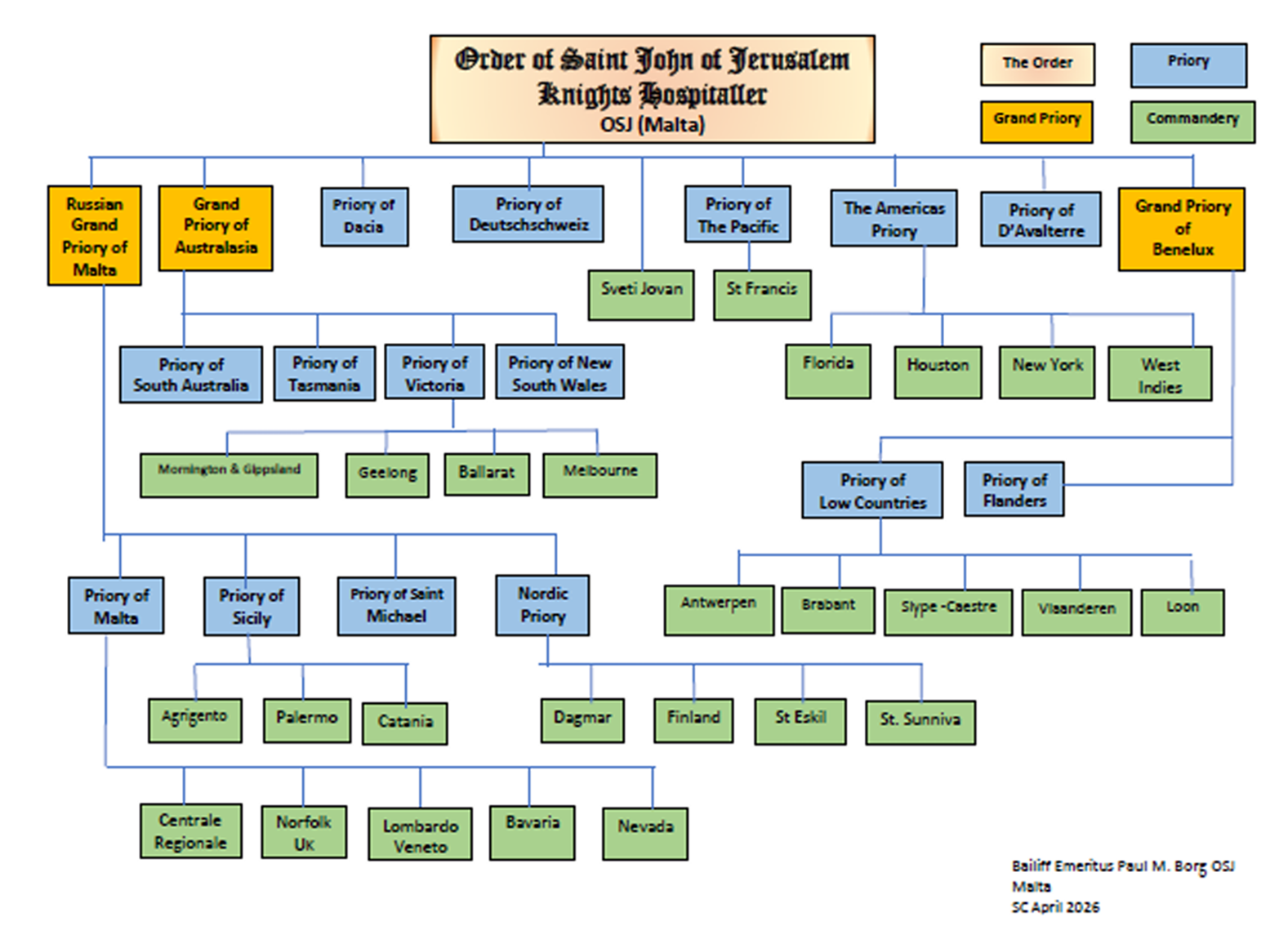 Aan de basis vinden we commanderijen die samen een prioraat vormen en verschillende prioraten vormen een grootprioraat. Commanderijen die niet tot een prioraat behoren maar onafhankelijk opereren, kunnen eveneens een afgevaardigde naar de soevereine raad sturen. Hun commandeur zal dan rechtstreeks verantwoording afleggen aan de kleine raad. De niet onafhankelijke commanderijen doen dit aan de prior die aan het hoofd staat van het prioraat en die op zijn beurt verantwoording aflegt aan de grootprior indien er een grootprioraat werd opgericht.